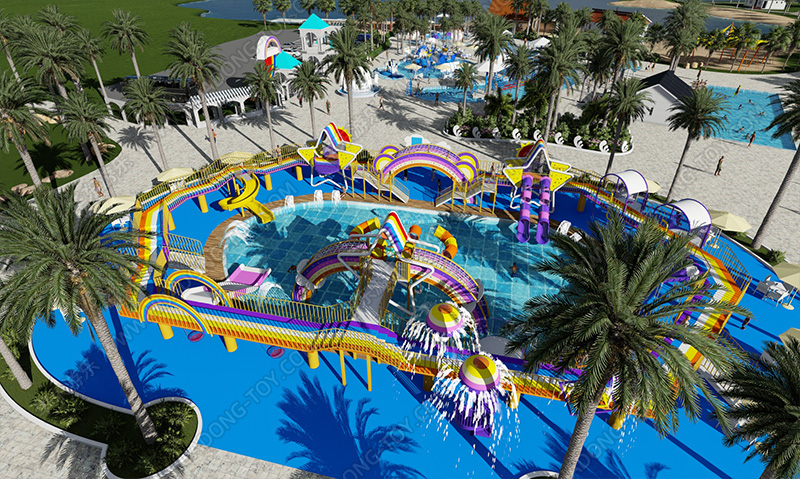 本案例设计灵感来源于天空中雨后的彩虹,这里充满的彩虹世界的斑斓世界,有五颜六色的的彩虹滑梯、色彩斑斓的彩虹桥,小朋友可以在彩虹中尽情的戏耍打闹,欢快的追逐天边的缤纷彩虹,整个水上乐园充满活泼奇特,色彩缤纷,在这里能够游泳,能够健身,让孩子们在玩的过程中激发了想象力,提高勇于挑战的勇气和游玩带来的欢乐!